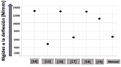 Al comparar los esfuerzos por flexión se puede apreciar que la estructura del mototaxi se encuentra en un valor de 6508,15 N/mm. Mientras que en los estudios revisados se muestran valores similares, lo cual muestra comportamiento de la estructura semejante (valores de 5 a 13 KN/mm) a otros estudios en la evaluación de rigidez por flexión.