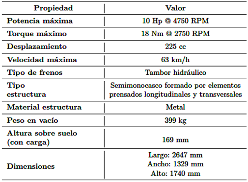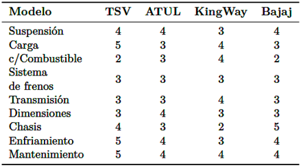 En la etapa de benchmarking se consideraron cuatro marcas líderes en México: TSV, ATUL, KingWay y Bajaj y sus principales modelos. Se analizaron ocho características de interés: la potencia máxima, el torque máximo, consumo, capacidad de carga, frenos, chasis y barra estabilizadora presentadas en la Tabla 2.