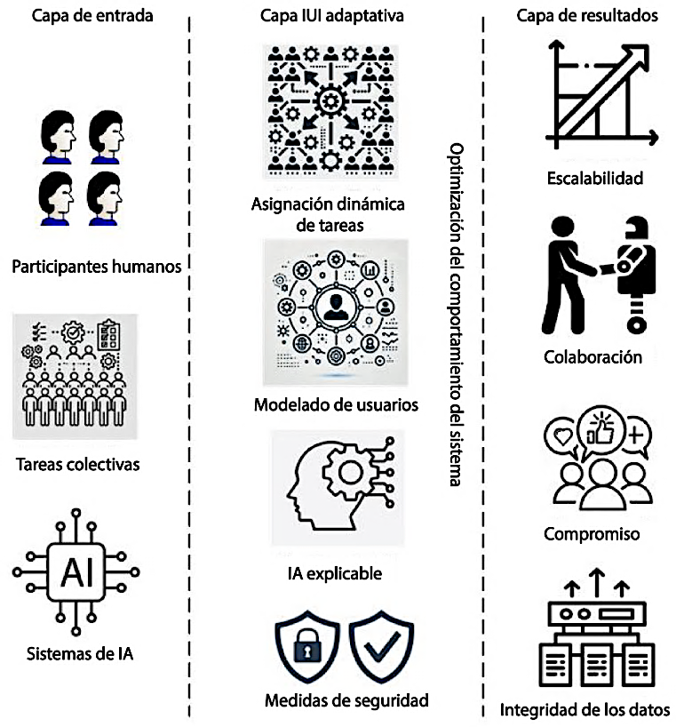 El flujo de tareas y datos se origina en la capa de entrada, donde los participantes humanos y los sistemas de IA interactúan con las tareas asignadas; progresa a través de la capa de IUI adaptativa, donde se procesan y optimizan los parámetros de interacción, y culmina en un mejor rendimiento del sistema dentro de la capa de resultados. Este marco demuestra cómo las IUI adaptativas pueden aprovecharse para mejorar la colaboración y la escalabilidad en entornos de crowdsourcing.