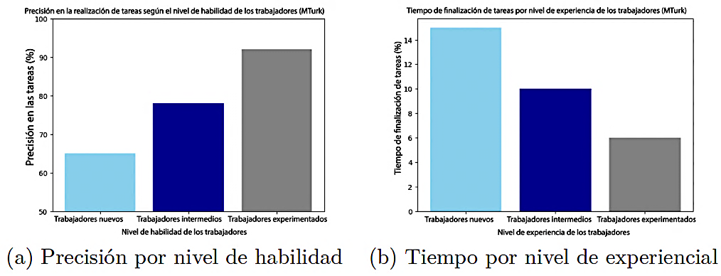 La Figura 4 ilustra el desempeño en la finalización de tareas dentro de la plataforma de crowdsourcing Amazon Mechanical Turk (MTurk). El sistema de asignación adaptativa de tareas implementado en Mturk mejora significativamente la eficiencia operativa, al asignar tareas complejas a trabajadores experimentados, lo que se traduce en mayor precisión y reducción de los tiempos de finalización.