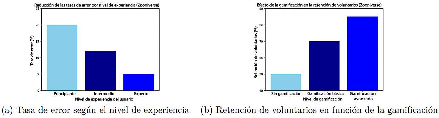 La Figura 5 ilustra el desempeño de la plataforma en términos de tasa de error según el nivel de experiencia del usuario, así como el impacto de los elementos de gamificación en la retención de voluntarios, destacando la relación directa entre personalización, motivación y precisión operativa.