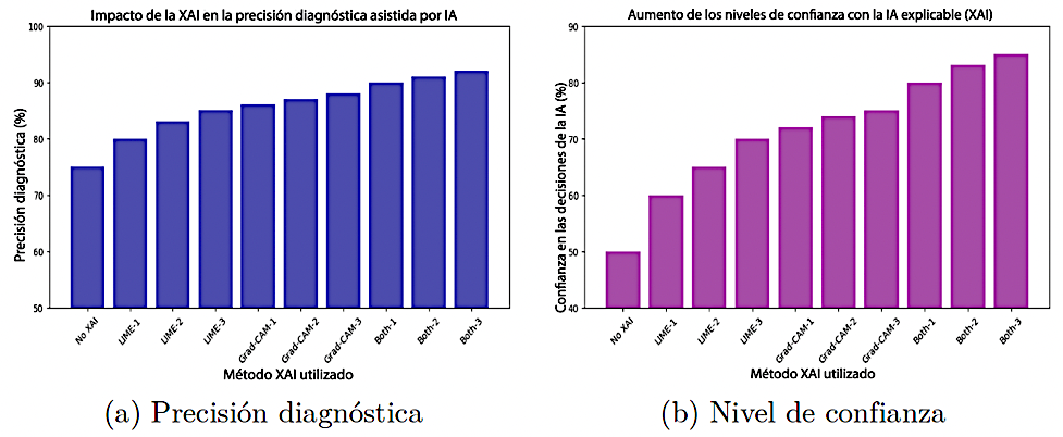 La Figura 6 ilustra el impacto de la integración de la XAI en los diagnósticos médicos asistidos por IA, destacando su contribución a la transparencia y la confianza en los sistemas automatizados. La incorporación de XAI mejora sustancialmente la interpretabilidad de los modelos diagnósticos.