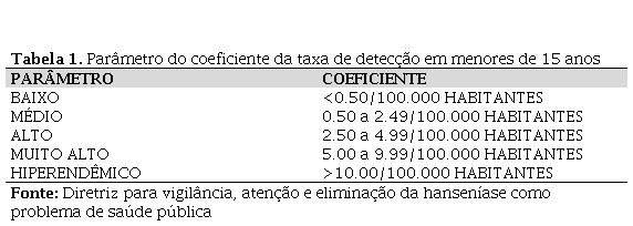 Posteriormente, foi realizado o levantamento da taxa de detecção em menores de 15 anos (1. numerador: casos de hanseníase em menores de 15 anos; 2. denominador: população menores de 15 anos no mesmo local e período; 3. multiplicador: 100.000). Foram seguidos os parâmetros preconizados pela Diretriz para Vigilância, Atenção e Eliminação da Hanseníase como Problema de Saúde Pública,9 apresentados na Tabela 1. Com o objetivo de garantir uma melhor consistência dos dados, para o cálculo do período de 2012 a 2021 foram utilizados as estimativas populacionais para cada ano, disponibilizada pelo Ministério da Saúde, enquanto para o ano de 2022 foi utilizado dados do censo populacional de 2022.