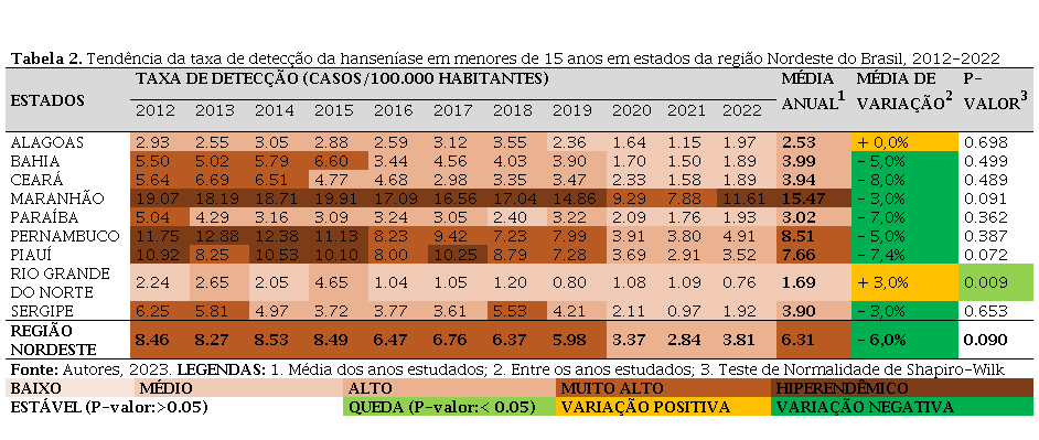 Foram diagnosticados 126.982 novos casos de hanseníase na região Nordeste, desses, 9.252 (7,3%) foram em menores de 15 anos, na Tabela 1 são apresentadas as tendências das taxas de detecção entre os Estados da região. Em geral, a região apresentou uma taxa média de detecção de 6.31/100.000 (muito alto), com tendência de estabilidade (p-valor: >0.05) e uma redução média de 3,0% ao longo dos anos de estudo. O estado do Rio Grande do Norte apesar de apresentar uma média de variação positiva (3,0%) foi o que apresentou a menor média da taxa de detecção (1.69/100.000 hab.) e tendência de queda (p-valor:0.009), os demais Estados apresentaram tendência de estabilidade. Os estados do Maranhão (15.47/100.000 hab.), Pernambuco (8.51/100.000 hab.) e Piauí (7.66/100.000 hab.) foram os que apresentaram as maiores média da taxa de detecção. Também foi visto que, a partir de 2020 a região e todos os estados apresentaram uma acentuada queda, em comparação aos anos anteriores, contudo, com exceção do estado do Rio Grande do Norte, foi observado aumento do ano de 2022, em comparação com os anos de 2020 e 2021.