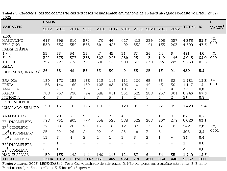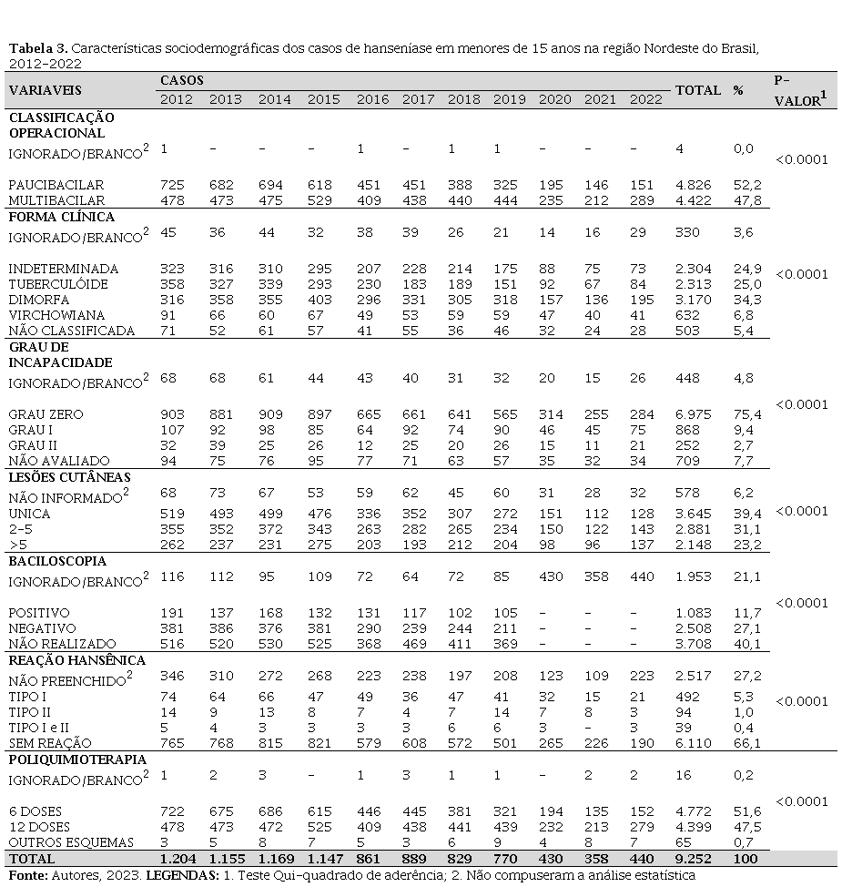 Com base nos resultados apresentados, é possível deduzir que a hanseníase em menores de 15 anos é um acentuado problema de saúde pública na região Nordeste. A maioria dos casos foram em indivíduos do sexo masculino, pardos, dos 10 aos 14 anos, com o ensino fundamental incompleto. As variáveis clínicas mostraram predominância de casos PB, de forma clínica dimorfa, menos de cinco lesões, sem a presença de incapacidade física e reações hansênica. Além disso, destacou-se a não realização da baciloscopia e uma maior orientação do uso de seis doses da PQT-U.