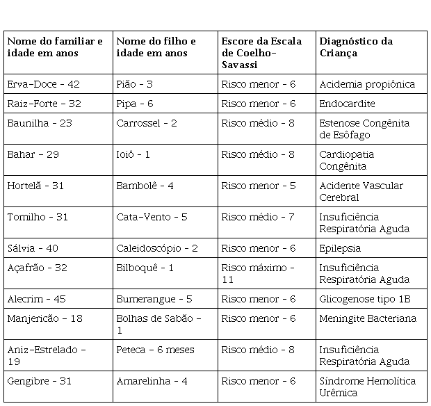 As famílias foram indicadas pelo enfermeiro responsável do plantão, sendo que os pesquisadores não tiveram contato prévio com os participantes, além da aplicação da Escala de Risco Familiar,12 instrumento de estratificação que determina o risco social e de saúde de famílias. Como critérios de inclusão, as famílias precisavam conviver com a criança, em domicílio e atender ao escore mínimo da Escala de Risco Familiar.12 O score de risco classifica a família em risco menor (5-6 pontos), risco médio (7-8 pontos) e risco máximo (acima de 9 pontos).