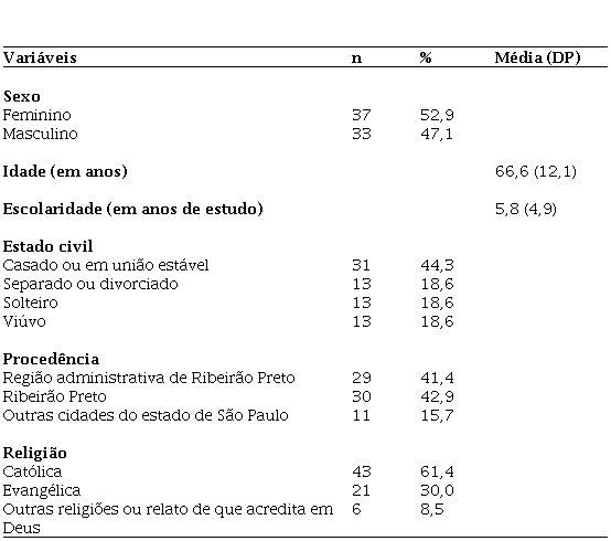 Participaram do estudo 70 pacientes que aguardavam pela primeira consulta com a equipe ambulatorial de CP. Na Tabela 1, são apresentados os dados sociodemográficos dos participantes.
