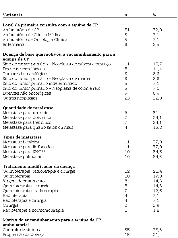Além dos dados sociodemográficos e clínicos coletados, os participantes foram questionados sobre o significado de CP e quanto às informações sobre o encaminhamento para a primeira consulta com a equipe ambulatorial de CP. Destaca-se que 56 (78,6%) participantes não sabiam o que são CP e 37 (52,9%) responderam não terem recebido informações a respeito do encaminhamento para a equipe de CP pelos médicos da clínica de origem.