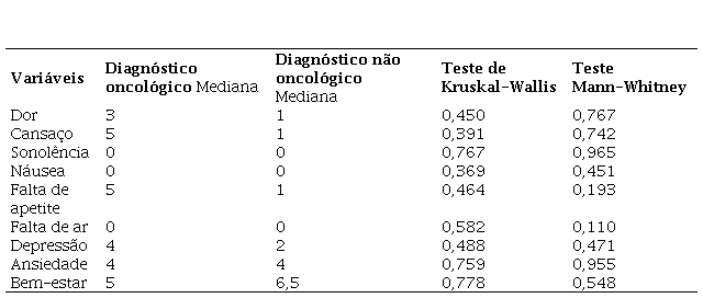 Na tabela 4, estão representadas as comparações entre os escores dos sintomas relatados pelos participantes com diagnósticos oncológicos e não oncológicos, considerando dados das intensidades dos sintomas de 66 participantes para a sonolência e 67 para os outros sintomas. Destaca-se que não houve diferença significativa entre os escores. A mediana da Escala de Desempenho em Cuidados Paliativos (versão 2) de participantes com diagnóstico oncológico foi 55 e a mediana dos participantes com diagnóstico não oncológico foi 50. O resultado do teste Kruskal-Wallis foi 0,776 e do teste Mann-Whitney foi 0,264. Logo, não foi identificada diferença significativa entre os dois grupos, considerando os sintomas relatados e a capacidade funcional entre os grupos.