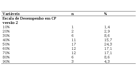 De acordo com os resultados do presente estudo, mais da metade dos participantes apresentaram escore de 50% ou menos na Escala de Desempenho em Cuidados Paliativos versão 2. Outro estudo identificou uma média de 56,77 em relação à funcionalidade dos participantes com a utilização da mesma escala.15 Ressalta-se que, valores iguais ou inferiores a 50% nessa escala, representam indivíduos com significativo comprometimento da capacidade funcional, indicando a necessidade de cuidados em tempo integral e, como consequência, reestruturação familiar para lidar com esse novo contexto.12