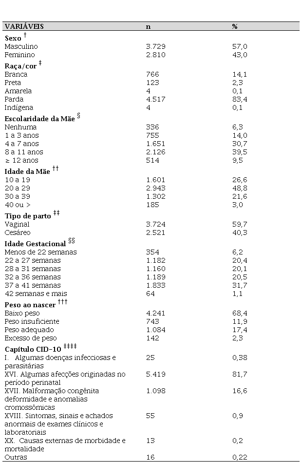 Quase três em cada cinco crianças nasceram por meio de parto vaginal (n=3.724; 59,7%) e parcela expressiva eram prematuras, uma vez que 67,2% (n=3.885) nasceram de gestações que duraram 36 semanas ou menos. A maioria dos óbitos ocorreu devido às afecções originadas no período perinatal (n=5.419; 81,7%) (Tabela 1).