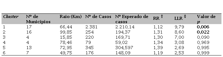 † RR: Risco relativo para o cluster comparado ao resto do estado.