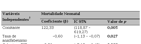 O ajuste ao modelo de regressão multivariado mostra que o conjunto das variáveis selecionadas foi capaz de explicar parcialmente a variabilidade (R2) da mortalidade neonatal em 33,73%. As variáveis independentes investigadas que apresentaram associação negativa com a mortalidade neonatal no modelo final foram: Taxa de analfabetismo (β = -0,60; p= 0,027), Cobertura da ESF (β = -2,80; p= 0,023) e IDHM (β = -0,60; p= 0,003) (Tabela 3).