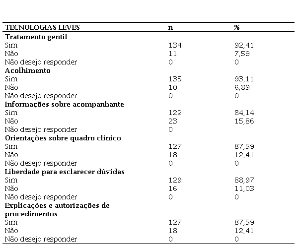 Ao analisar as tecnologias leves individualmente na tabela 1, observou-se um bom aproveitamento delas, com percentuais variando de 84,14% a 93,11% das parturientes utilizando essas tecnologias.