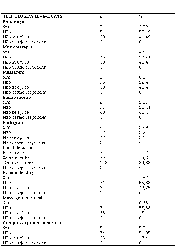 Quanto às tecnologias leve-duras, o partograma foi utilizado em 84 (57,6%) dos trabalhos de parto, seguido pela massagem (n=9, 6,2%) e, em seguida, pela compressa para proteção do períneo (n=8, 5,51%).