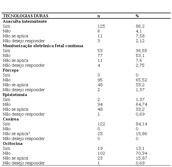 Referente ao uso de tecnologias duras, os instrumentos mais utilizados foram a ausculta intermitente (86,2%, n=125) e a cesárea (84,13%, n=122).