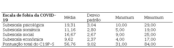 Tabela 1 - Distribuição da pontuação média da fobia de Covid-19 dos participantes e suas subescalas