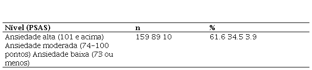 Além disso, os níveis de ansiedade pós-parto de 61,6% das participantes foram considerados altos, 34,5% das participantes apresentaram níveis moderados de ansiedade pós-parto e 3,9% apresentaram níveis baixos de ansiedade pós-parto (Tabela 2).
