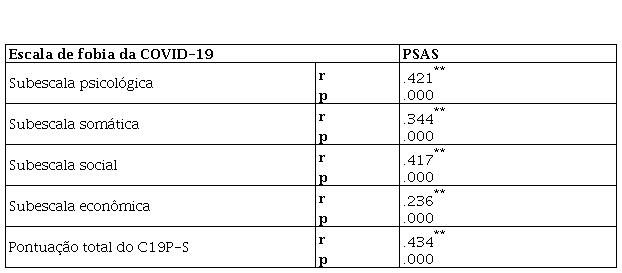Tabela 3 - Resultados da análise de correlação entre a escala de fobia da COVID-19 e as pontuações da escala de ansiedade específica pós-parto das participantes