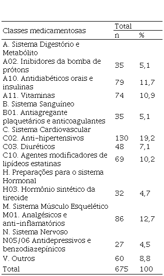 O número de medicamentos variou de dois a 17 por idoso. O número médio de medicamentos utilizados diariamente foi de seis e o total de medicamentos da amostra foi de 675. O número de medicamentos total por categoria foram: para o sistema digestório e metabólito, 35 (5,1%) os inibidores da bomba de prótons, 79 (11,7%) os antidiabéticos orais e insulinas e 74 (10,9%) as vitaminas; no sistema sanguíneo, 35 (5,1%) entre os antiagregantes plaquetários e anticoagulantes; no sistema cardiovascular, 130 (19,2%) os anti-hipertensivos, 48 (7,1%) os diuréticos e 69 (10,2%) os agentes modificadores de lipídeos as estatinas; na classe das reparações para o sistema hormonal, 32 (4,7%) o hormônio sintético da tireoide; no sistema músculo esquelético, 86 (12,7%) analgésicos e anti-inflamatórios; no Sistema Nervoso Central (SNC), 27 (4,5%) antidepressivos e benzodiazepínicos, seguindo a classificação ATC. (Tabela 1)