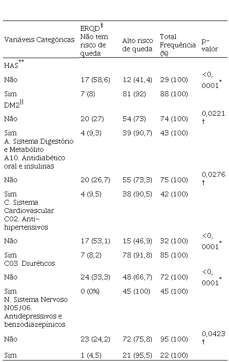 *Diferença estatisticamente significante pelo teste de Exato de Fisher (p<0,05); †Diferença estatisticamente significante pelo teste de Qui-Quadrado (p<0,05); ‡ERQD: Escala de Risco de Quedas de Downton; **HAS: Hipertensão Arterial Sistêmica; ||DM2: Diabetes Mellitus tipo 2