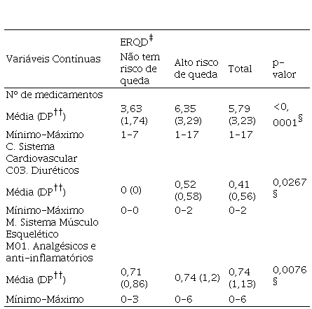 §Diferença estatisticamente significante pelo teste de Mann-Whitney (p<0,05); ‡ERQD: Escala de Risco de Quedas de Downton; ††DP: desvio padrão