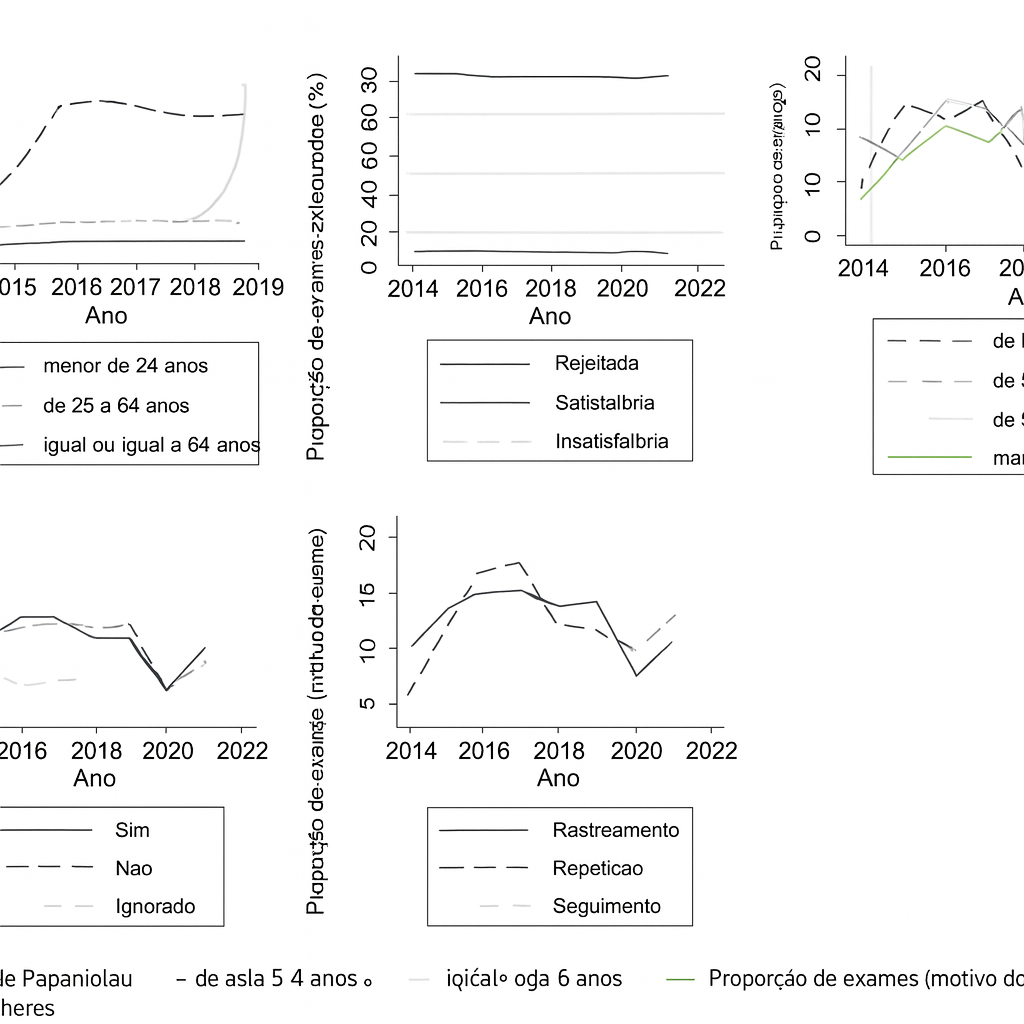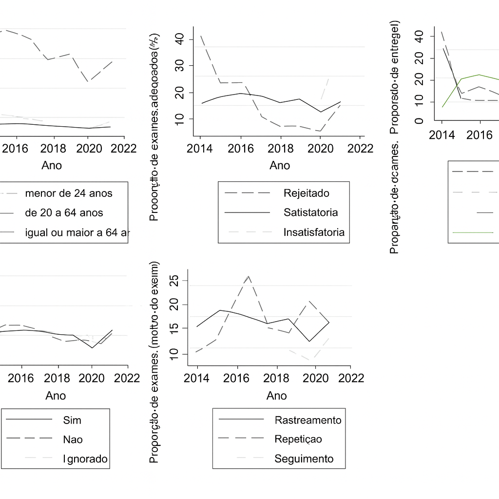 Não foram observadas tendências significativas em nenhuma das categorias de adequabilidade, sugerindo que a qualidade dos resultados dos exames permanece estável ao longo do tempo (Tabela 2, Gráficos 1 e 2). Isso é relevante, dado que se esperava uma tendência crescente na categoria "Satisfatória" e uma tendência decrescente nas categorias "Rejeitada" e "Insatisfatória". Quanto à proporção, resultado similar foi observado em estudo realizado no Pará, as porcentagens foram muito semelhantes às regiões comparadas, com 98,33% de adequabilidade.14