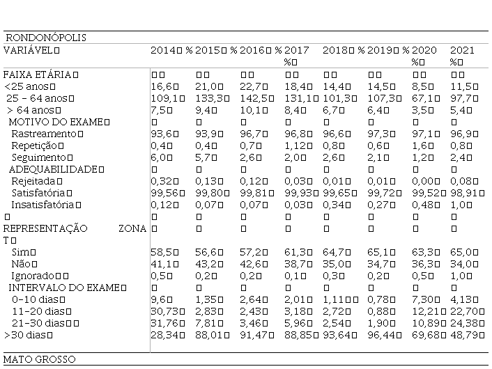 A partir deste estudo, foi possível observar que a faixa etária que mais se submeteu ao exame citopatológico na cidade de Rondonópolis e no estado de Mato Grosso foi o grupo etário de “25 a 64 anos”, o principal motivo de exame foi o “rastreamento”, e maioria das amostras foram “adequadas”, pouco mais da metade apresentou a representação da Zona de Transformação e mais da metade demorou “mais de 30 dias” para receber o resultado dos exames.