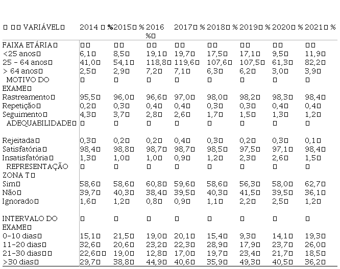 Os critérios de inclusão foram todas as mulheres que realizaram o exame Papanicolaou no período de 2014 a 2021, com a faixa etária de 25 a 65 anos. Os critérios de exclusão duplicidade dos dados e/ou dados com preenchimento incompleto.