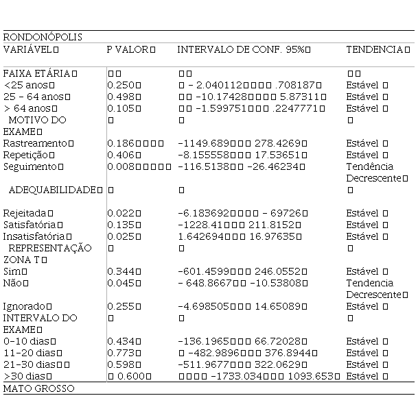 Tabela 2 – Tendência do rastreamento do câncer de colo uterino, de acordo com as variáveis analisadas. Rondonópolis e Mato Grosso, 2014 a 2021.