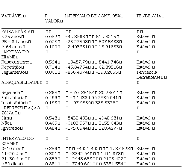Não foram observadas tendências significativas no "Intervalo de Resultado" em nenhuma das regiões analisadas Rondonópolis e Mato Grosso (Tabela 2, Gráficos 1 e 2). Isso sugere que a distribuição dos resultados dos exames não apresentou mudanças substanciais ao longo do período analisado. Esperava -se uma tendência decrescente nos exames entregue com mais de 30 dias.