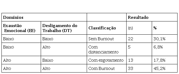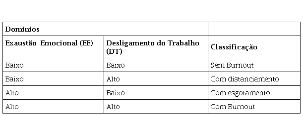 A escala OLBI utiliza a estrutura likert para as respostas, cuja pontuação varia de um ponto (discordo plenamente) a quatro pontos (concordo plenamente) e algumas variáveis têm seus escores invertidos para a soma das médias nas dimensões.12 Para fins de resultado, seguiu-se a orientação: escores médios ≥ 2,25 na dimensão EE e escores médios ≥ 2,1 na dimensão DT foram considerados altos.12 Os indivíduos foram classificados conforme apresentado no Quadro 1.