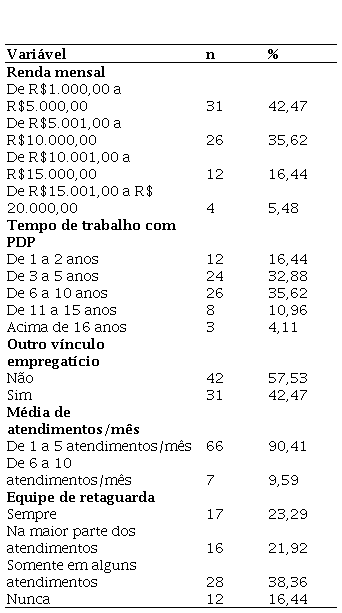 Participaram profissionais de quatro regiões do país (Sudeste, Nordeste, Centro-Oeste e Sul), distribuídas em 11 estados brasileiros (São Paulo, Minas Gerais, Rio de Janeiro, Distrito Federal, Bahia, Rio Grande do Norte, Maranhão, Paraíba, Rio Grande do Sul, Santa Catarina e Paraná). As características relacionadas ao trabalho na assistência ao PDP estão descritas na Tabela 1.