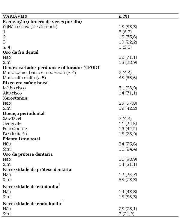 Em relação ao risco de SB, 14 (31,1%) apresentaram alto risco, 19 (42,2%) referiram xerostomia e 30 (66,7%) foram diagnosticados com DP, sendo 11 (24,5%) gengivite e 19 (42,2%) periodontite. Ademais, 11 (24,4%) eram edêntulos totais, 14 (31,1%) utilizavam próteses dentárias e 33 (73,3%) necessitavam desta. Ainda, 18 (56,3%) precisavam de exodontia e sete (21,9%) de endodontia.