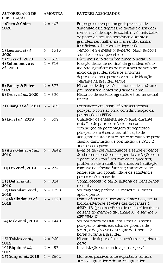 A revisão dos estudos longitudinais apontou uma variação considerável na incidência de sintomas depressivos pós-parto, de 0,18% na Holanda até 27,87% em Taiwan na China, mas na maioria dos estudos esteve abaixo de 20%, sendo os fatores mais comumente associados história prévia de depressão (durante a gravidez ou não)8,19,27 nível de estresse e relação familiar estressante16,22-23 baixo apoio social,2,8,16 presença de ansiedade ou outros transtornos psiquiátricos como comorbidade7,19,23 e experiência negativa ou complicações durante o parto.7,21,27