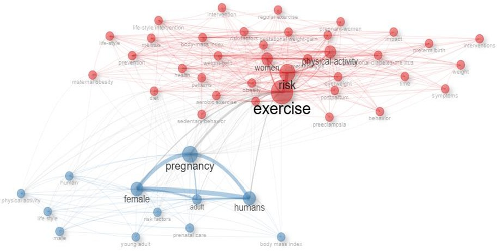 Além disso, foi identificado na rede de co-ocorrência que as palavras exercício, risco e atividade física foram as mais utilizadas pelos autores durante suas descrições textuais. Palavras estas diretamente relacionadas com o tema proposto, visto que as atividades físicas/exercícios realizados de forma regular contribuem para o bom prognóstico e manutenção da saúde em gestações de alto risco. Veja a imagem de co- ocorrência: