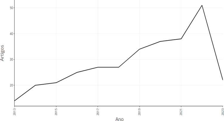 No presente estudo foram analisados 316 artigos. Observou-se que o maior número de publicações sobre o tema foram realizadas no ano de 2022 com 51 (16,13%) artigos, seguido do ano de 2021 com 38 (12%) artigos e 2020 com 37 (11,7%) artigos publicados, o que corresponde a uma taxa de crescimento anual de publicação de 4,62%, conforme pode ser observado no Gráfico 1 a seguir.