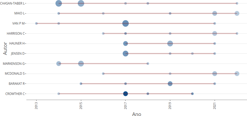 Para cumprir a Lei de Lotka, observou-se que a autora mais prevalente no assunto ao longo dos 10 anos estudados foi Lisa Chasan-Taber com 11 (3,48%) artigos, seguida de Linda E. May com 7 (2,2%) artigos e Mireille N. M. van Poppel com, também, 7 (2,2%) artigos. Em adição, foi observado que o ano que mais se produziu pelos principais autores foi o de 2017 com um total de 17 (5,37%) artigos. Dados demonstrados no gráfico abaixo.