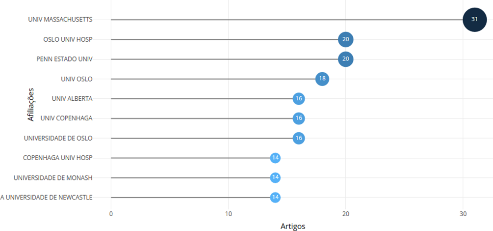 Dentre as instituições que mais publicam sobre o assunto evidenciou-se a Universidade de Massachusetts com 31 (9,8%) publicações, seguido do Hospital Universitário de Oslo com 20 (6,3%) publicações e da Universidade Estadual da Pensilvânia também com 20 (6,3%) publicações.Veja o gráfico abaixo: