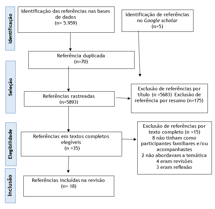 Foram incluídos artigos originais, nos idiomas inglês, português e espanhol; sem recorte de tempo; que tivessem como participantes familiares e ou/acompanhantes de crianças hospitalizadas. Foram excluídos os que abordavam a ludoterapia por ser uma técnica psiquiátrica, devendo ser realizada apenas por psiquiatra, psicólogo ou enfermeiro psiquiatra, em consultório.9
