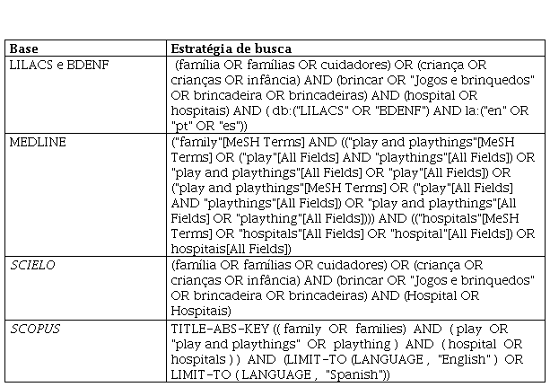 A busca foi realizada entre os meses de março a maio de 2022 a partir da pergunta utilizando-se os acrônimos P (população), C (conceito) e C (contexto): O que os estudos abordam sobre do brincar no hospital na perspectiva do familiar da criança? Os Descritores em Saúde (DECS), Medical Subject Headings (MeSH) e termos que expressavam a temática foram os seguintes: família, famílias, cuidadores, family, families; criança, crianças, infância, child, children, childhood; jogos e brinquedos, brincar, brincadeiras, brincadeiras, play, play and playthings, plaything, playthings; hospital, hospitais, hospital e hospitals. Os booleanos OR e AND foram utilizados entre eles.
