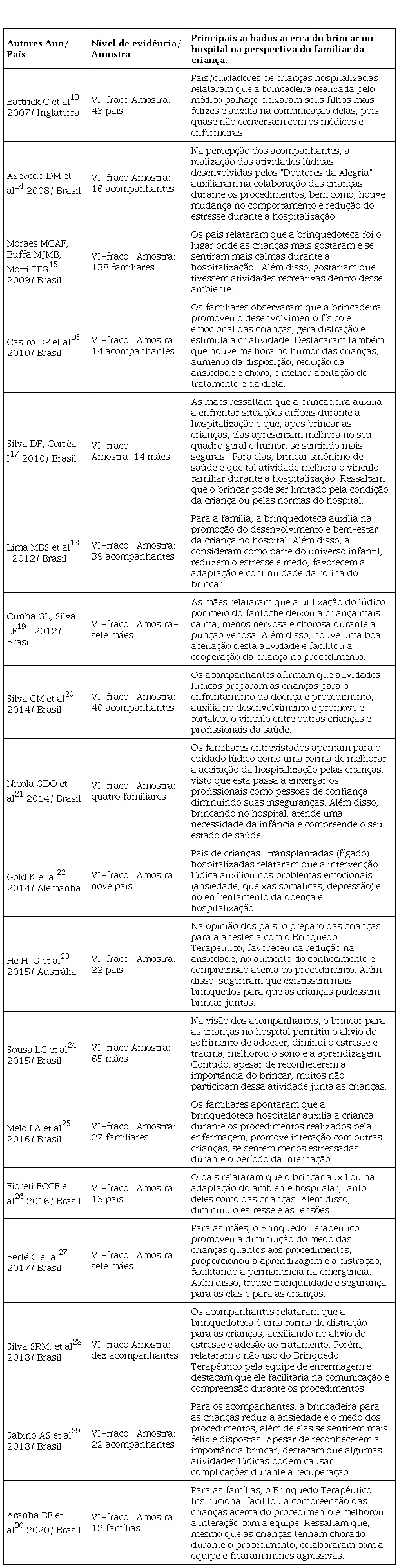 No quadro 2, os estudos encontrados foram organizados quanto aos autores/ano/país, nível de evidência/amostra e principais resultados acerca do brincar no hospital na perspectiva do familiar da criança.