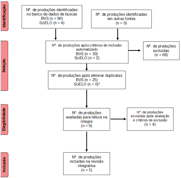 Foram identificadas, ao total, 100 produções nas fontes de pesquisadas, sendo que a maioria encontrava-se na BVS (96; 96%). Desde total, a partir da aplicação dos critérios de inclusão e de exclusão, bem como leitura de título, resumo e do artigo na íntegra, chegou-se ao total de cinco produções inclúidas na revisão integrativa (Figura 1).