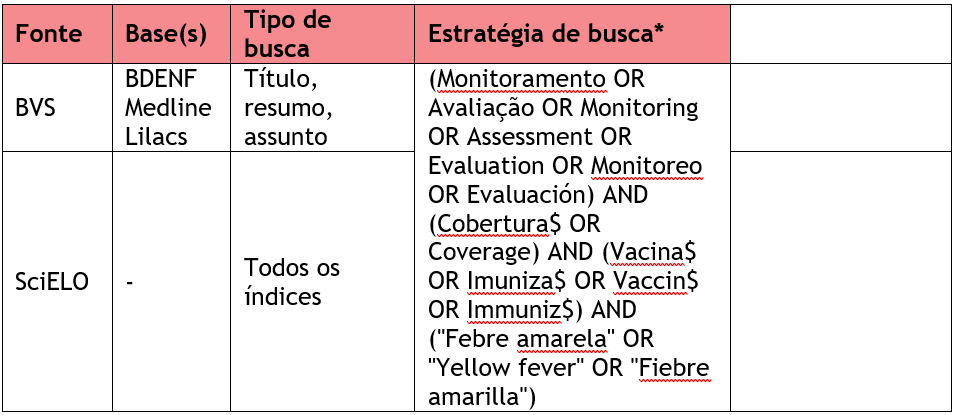 Para a recuperação da informação em saúde foi elaborada a seguinte pergunta de pesquisa: Quais foram as estratégias de monitoramento e avaliação da cobertura vacinal de vacina contra FA utilizadas no Brasil?