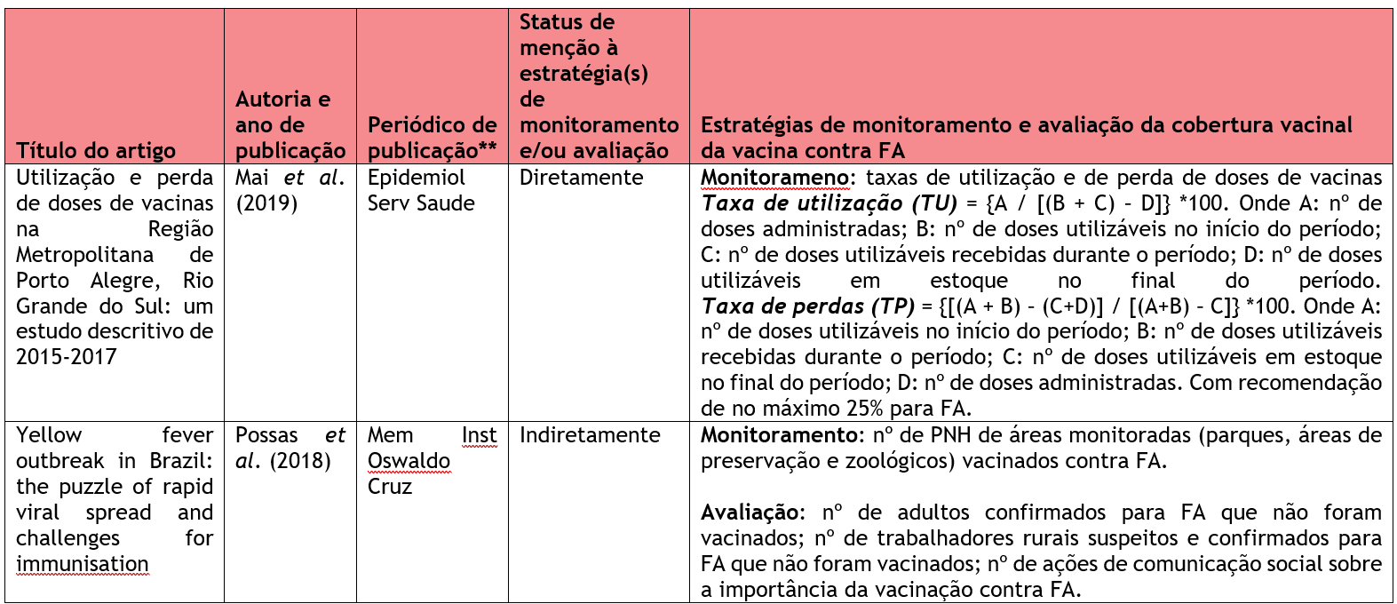 Com relação às estratégias de monitoramento da cobertura vacinal da vacina contra FA no Brasil, foi possível resgatar contribuições dos artigos publicados por Gava et al.16 e Mai et al.17, de maneira direta, e de Possas et al.18 e Silva et al.19, de maneira indireta.