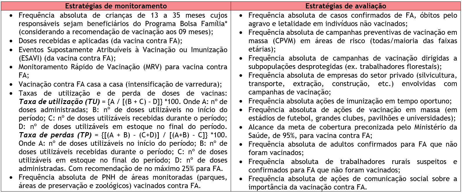 Com relação às estratégias diretas de monitoramento da cobertura vacinal da vacina contra FA no Brasil, foram identificadas: i) cálculos de cobertura vacinal e de doses aplicadadas; ii) MRC; iii) intensificação vacinal; iii) levantamento de ESAVI; iv) e taxas de utilização e de perdas. Já de estratégias indiretas: i) número de PNH de áreas monitoradas (parques, áreas de preservação e zoológicos) vacinados contra FA: ii) e a possibilidade de se utilizar o número de crianças de 13 a 35 meses cujos responsáveis sejam beneficiários do Programa Bolsa Família.