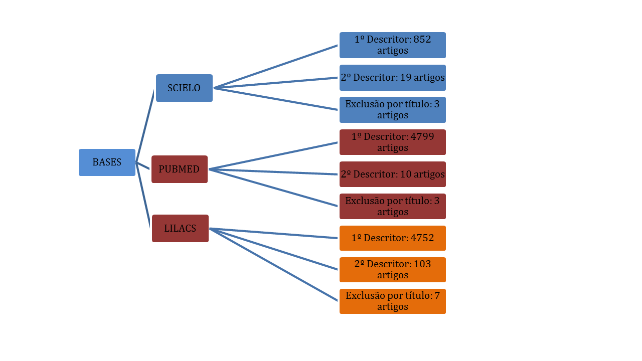 Na base Scielo, ao utilizar o primeiro descritor, resultou em 852 artigos; ao adicionar o segundo, reduziu para 19; após exclusão por títulos que não condiziam com o objetivo deste estudo, foi utilizado 3 artigos. Já na segunda base, a primeira busca apresentou 4799 artigos; com a junção do outro descritor, 10 artigos; após exclusão de textos divergentes do objetivo, utilizou 3 artigos. No último, ao adicionar o primeiro descritor, 4752 artigos foram apresentados. Com a soma do segundo, reduziu-se para 103; com a exclusão do título, foram utilizado 7 artigos. Conforme resumido no esquema abaixo: