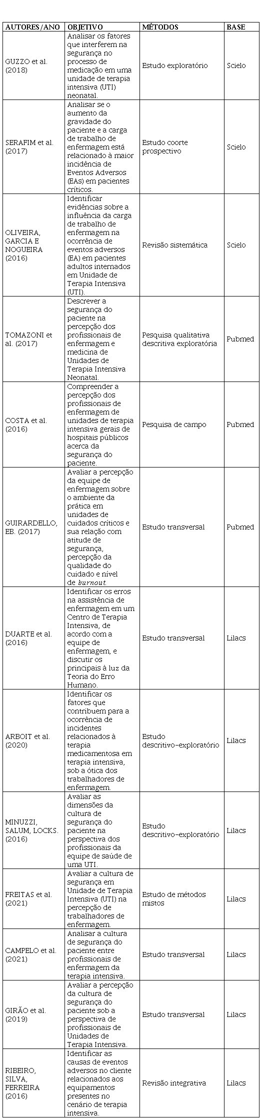10. Costa TD, Salvador PTCO, Rodrigues CCFM, Alves KYA, Tourinho FSV, Santos VEP. Percepção de profissionais de enfermagem acerca de segurança do paciente em unidades de terapia intensiva. Rev. Gaúcha Enferm. [Internet]. 2016 [acesso em 5 de maio de 2022];37(3). Disponível em: https://doi.org/10.1590/1983-1447.2016.03.61145.
