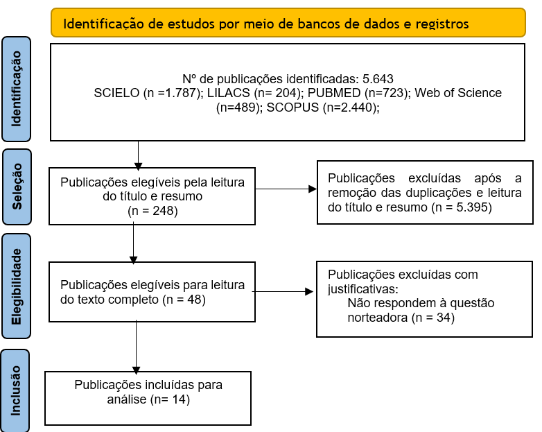 A busca possibilitou recuperar 5.643 estudos, dos quais serão foram incluídos na amostra somente aqueles com foco na saúde sexual e reprodutiva da população LGBTQIA+. Após aplicação dos critérios de inclusão previamente estabelecidos, o número de artigos foi reduzido para 48, sendo excluídos 34 por não possuírem relação com o objeto de estudo. Assim, foram selecionados 14 artigos para análise e discussão. Os detalhes do processo de seleção dos estudos, conforme a recomendação PRISMA, estão apresentados na Figura 1