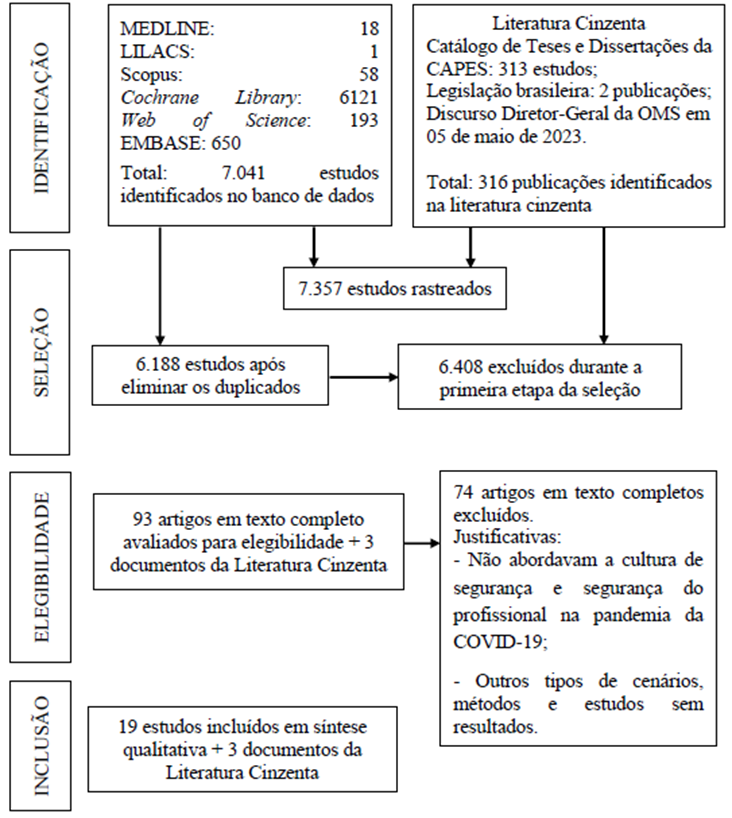 A busca em sete bases de dados gerou um quantitativo de 7.357 estudos. Com a leitura de título e resumo foram selecionados 93 artigos para leitura na íntegra. Após essa etapa, 74 artigos foram excluídos, com o resultado de 19 estudos que versavam sobre a temática proposta e 03 documentos da literatura cinzenta.